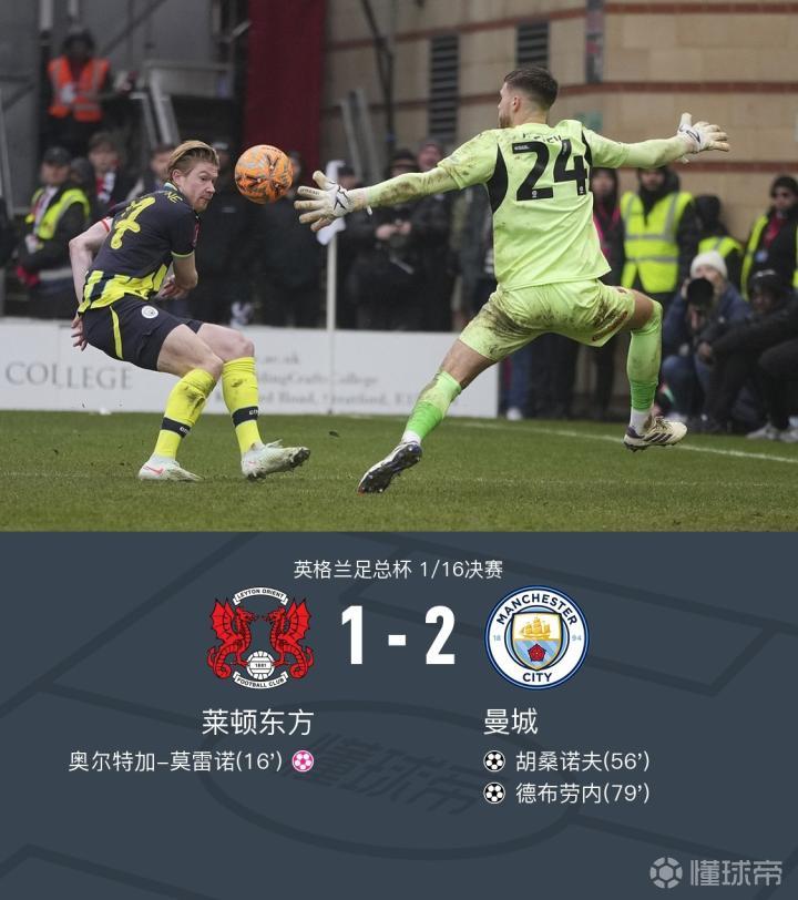 下半场比赛中,曼城展现出强大的反击能力。刘易斯在56分钟助攻胡桑诺夫破门,为曼城扳平比分。随后,在79分钟,德布劳内替补登场并巧妙射门得分,领先比分。最终,曼城2-1逆转莱顿东方,成功晋级足总杯16强。