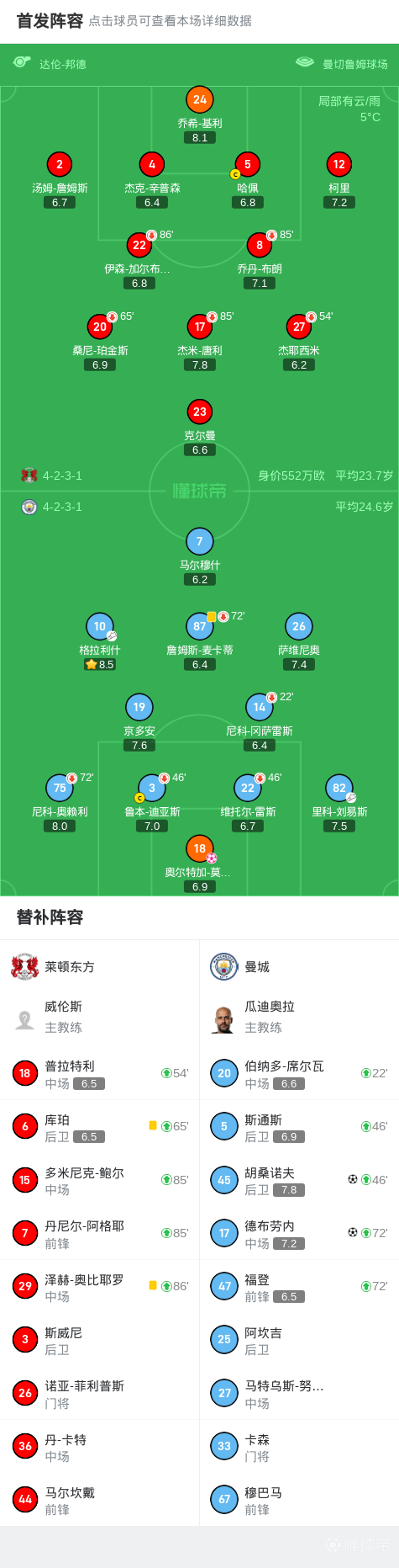 第56分钟,曼城终于扳平比分。刘易斯远射打中胡桑诺夫身上入网,为球队送来宝贵的平局。而在79分钟,格拉利什的精妙传球为德布劳内的进球奠定基础,曼城成功反超比分。尽管莱顿东方在最后阶段多次制造险情,但曼城的防守稳固,成功保住胜利。